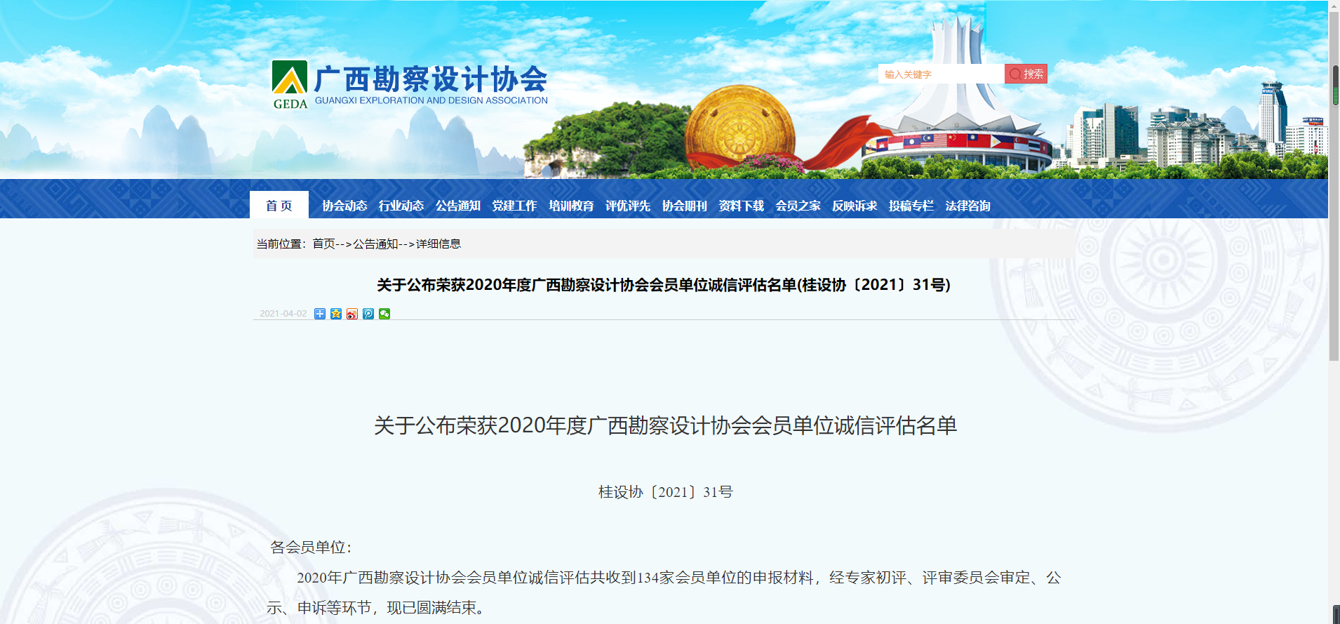 為推動廣西勘察設(shè)計行業(yè)誠信建設(shè),廣西勘察設(shè)計協(xié)會于2020年11月啟動了2020年廣西勘察設(shè)計協(xié)會會員單位誠信評估工作。此次誠信評估工作共有134家會員單位申報,經(jīng)專家初評、評審委員會工作會議審查、公示等多個環(huán)節(jié),共有47家會員單位滿足誠信評估等級,其中,獲評AAA級誠信單位20家,獲評AA級誠信單位11家,獲評A級誠信單位16家。