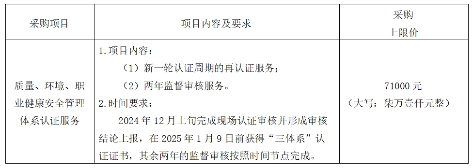 2024年12月上旬完成現場認證審核并形成審核結論上報,在2025年1月9日前獲得“三體系”認證證書,其余兩年的監督審核按照時間節點完成。服務期限內,如中標人未能按照合同條款約定履行合同義務,采購人有權提前終止合同(具體以簽訂合同為準)。
