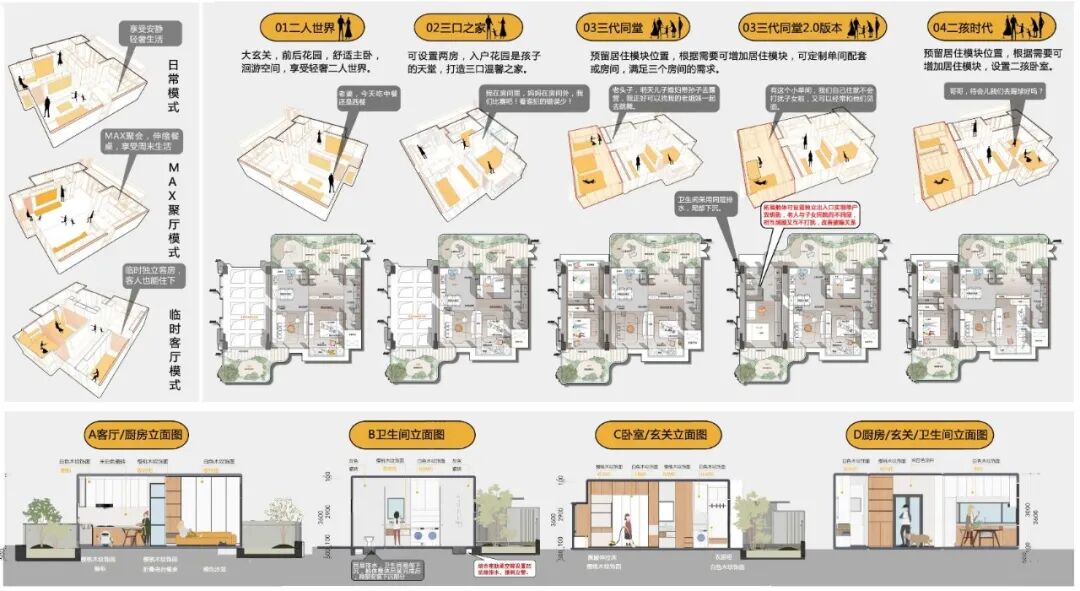 項目參賽戶型建筑面積為69.5㎡,定位為“小而美”的第四代花園住宅。我們深入分析南寧市場需求,以“花園式住宅,裝配式工廠化生產(chǎn)、全齡段多場景可變住宅” 為產(chǎn)品定位 ,旨在破解住宅建筑難點,在有限面積內(nèi)創(chuàng)造無限可能。